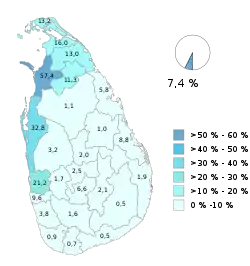 في تعداد عام 2012 وصلت نسبة المسيحيين في سريلانكا إلى حوالي 7.4% من السكان أي 1,509,606. يشكل أتباع الكنيسة الرومانية الكاثوليكية كبرى الطوائف المسيحية في البلاد، حيث أنَّ حوالي 82% من مجمل المسيحيين في سريلانكا هم رومان كاثوليك، ويُنسب تراثهم الديني مباشرةً إلى البرتغاليين. وينقسم البروتستانت بالتساوي بين الكنيسة الأنجليكانية والمذاهب البروتستانتية الأخرى.[2] معظم مسيحيي سريلانكا من العرقية السنهاليَّة والتاميليَّة. هناك مجتمع مسيحي سنهالي ملحوظ، خصوصاً في المقاطعات البحرية في سريلانكا،[25] ويتبع معظم المسيحيين السنهاليين المذهب الكاثوليكي بالإضافة إلى أقلية بروتستانتية،[26] وتعد مدينة نغومبو المركز الثقافي للمسيحيين السنهاليين. يعود أصول المجتمع التاميلي الكاثوليكي إلى الفتح البرتغالي لمملكة جفنا، ويعود أصول الأقليّة التاميليَّة البروتستانتيَّة بسبب الجهود التبشيرية في القرن الثامن عشر من قبل منظمات مثل بعثة سيلان الأمريكية.[27] معظم التاميليين الذين يسكنون المقاطعة الغربية هم من الرومان الكاثوليك، في حين أن سكان المقاطعات الشمالية والشرقية هم من الهندوس بشكل رئيسي.[28] يُعرف الشريط الساحلي من جافنا إلى شيلاو أيضاً بإسم "الحزام الكاثوليكي".[29] وحافظ المسيحيين التاميل على تراثهم في المدن الكبرى مثل نغومبو وتشيلاو وبوتالام، وكذلك في قرى مثل مامبوري.[30] وتنشط الكنائس الخمسينية وغيرها من الكنائس مثل شهود يهوه، بين النازحين واللاجئين.[31] وتتبتع أقلية البرغر الدين المسيحي على المذهب الكاثوليكي والأنجليكاني ومذهب الكنيسة المصلحة الهولندية، والبرغر هم مجموعة عرقية أوروآسيوية صغيرة في سريلانكا ينحدرون من البرتغالين والهولنديين والبريطانيين وغيرهم من الرجال الأوروبيين الذين استقروا في سريلانكا وتزوجوا من النساء السريلانكيات المحليات.[32][33] أثناء الحكم البريطاني، احتلّ البرغر مكاناً مهماً للغاية في الحياة الاجتماعية والاقتصادية السريلانكية.[34] وحافظ معظم البرغر على العادات الأوروبية. خاصةً بين أولئك الذين من أصول برتغاليّة، والذين "احتفظوا بدينهم ولغتهم الأوروبية بكل فخر".[35][36]