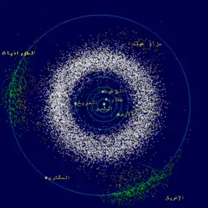|CitationClass=تم تجاهله (مساعدة)صيانة CS1: أسماء متعددة: قائمة المؤلفون (link) - Horner, J.; Jones, B. W. (2008). "Jupiter - friend or foe? I: the asteroids". International Journal of Astrobiology. 7 (3–4): 251–261. arXiv:0806.2795. Bibcode:2008IJAsB...7..251H. doi:10.1017/S1473550408004187. الوسيط