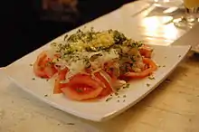 سلطة الأوروجواي تحتوي على الطماطم مع الخس والبصل ويتم تقديمها مع صلصة الخل المصنوعة من الزيت والخل والملح والثوم