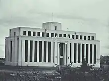 صورة لمبنى المكتبة الوطنية الأسترالية الأصلي في جادة كنغز في كانبرا التقطها ويليام جيمس ميلدنهال [الإنجليزية] قبل عام 1948.