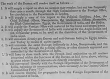 وفقًا لورقة لجنة الدفاع الإمبراطوري المؤرخة في 7 يناير 1916 تم إنشاء المكتب العربي "لتنسيق النشاط السياسي البريطاني في الشرق الأدنى ... وابلاغ المكتب الخارجي ومكتب الهند ولجنة الدفاع ومكتب الحرب والأميرالية وحكومة الهند في وقت واحد بالميل العام للسياسة الألمانية التركية[2]."
