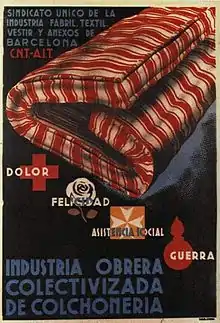 " الصناعة العماليه المجمعه للمفروشات" جمله علي ملصق مزور اعلن من قبل الحكومة الثانية للجمهوريه الاسبانيه في 13 من مايو عام 1937. يتسلط الضوء في ملصقات الفصيل الجمهوري علي اهميه التعليم، النضال ضد الفاشيه، ضروره النضباط، شعرات من اجل الشركات المموله، الخ. و بالاخذ بعين الاعتبار لهذه الرموز، فقد تمثلوا في المنجل، المطرقه و ادوات صناعيه أخرى (مثل التروس أو المفارق) و النجمة ذي الخمس نقاط و ذي ثلاثه(النجوم العالميه).