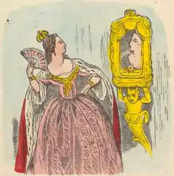 الملكة هي زوجة أبي سنو الشريرة والانتقامية المهووسة بأنها "الأكثر عدالة في الأرض". تثير الأميرة الشابة الجميلة سنو وايت إحساس الملكة بالحسد ، لذلك تصمم الملكة عددًا من الخطط لقتل سنو وايت من خلال استخدام السحر. القوة الدافعة في القصة هي مرآة الملكة السحرية. في القرار التقليدي للقصة ، يتم إعدام الملكة بذكاء بسبب جرائمها. وتهدف الحكاية كدرس للأطفال الصغار يحذرونهم من النرجسية والكبرياء.