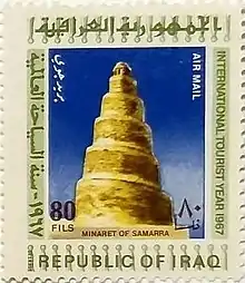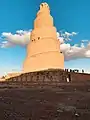 المئذنة الملوية إحدى معالم العراق المميزة بسبب شكلها الفريد، فهي احدى آثار العراق القديمة المشهورة.[2] بنيت في الأصل منارة مئذنة للمسجد الجامع الذي أسسه المتوكل بالله العباسي عام 237 هـ في الجهة الغربية لمدينة سامراء بتصميم المعماري دليل بن يعقوب، والذي كان يعد في حينه من أكبر المساجد في العالم الإسلامي. المئذنة الملوية جاء اسمها من شكلها الاسطواني[؟]الحلزوني وهي مبنى من الطابوق الفخاري يبلغ ارتفاعه الكلي 52 مترا وتقع على بعد 27.25 مترا من الحائط الشمالي للمسجد، وترتكز على قاعدة مربعة ضلعها (33 م) وارتفاعها (3 م) يعلوها جزء اسطواني مكون من خمس طبقات تتناقص سعتها بالارتفاع يحيط بها من الخارج سلم حلزوني بعرض 2 متر يلتف حول بدن المئذنة بعكس اتجاه عقارب الساعة ويبلغ عدد درجاته 399 درجة. في أعلى القمة طبقة يسميها أهل سامراء بـ "الجاون" وهذه كان يرتقيها المؤذن ويرفع عندها الأذان.
