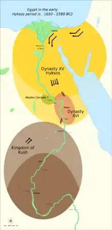 يُنظر إلى أحمس الأول على أنه مؤسس الأسرة الثامنة عشرة. واصل حملات والده سقنن رع وكاموس ضد الهكسوس حتى قام بإعادة توحيد البلاد مرة أخرى. ثم يواصل أحمس حملته في بلاد الشام ، موطن الهكسوس ، لمنع أي غزو مستقبلي لمصر.[6]