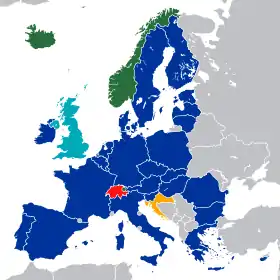 ![]() دول الاتحاد الأوروبي التي تشكل جزءًا من المنطقة الاقتصادية الأوروبية دول الرابطة الأوروبية للتجارة الحرة التي تشكل جزءًا من المنطقة الاقتصادية الأوروبية (آيسلندا، النرويج، ليختنشتاين) دولة من خارج الاتحاد الأوروبي / من خارج الرابطة الأوروبية للتجارة الحرة والتي تشكل بشكل انتقالي جزءًا من المنطقة الاقتصادية الأوروبية (بريطانيا)[1] دولة في الاتحاد الأوروبي تشكل جزءًا من المنطقة الاقتصادية الأوروبية من خلال التطبيق المؤقت لاتفاقية الانضمام (كرواتيا) دولة في الرابطة الأوروبية للتجارة الحرة التي وقعت على اتفاقية المنطقة الاقتصادية الأوروبية لكنها لم تصادق إليها (سويسرا) | |
