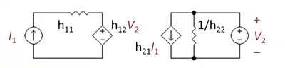 حيث متغيرات الجهد والتيار كما هو موضح بالشكل . و يستخدم نموذج الدائرة المولدات المعتمدة كطريق بديل لتمثيل المصفوفة .