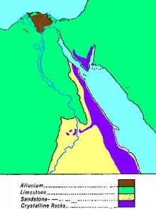 ويخترق مجرى نهر النيل في مساره من أسوان إلى الجيزة مجموعة من التكوينات الجيولوجية التي تظهر بالتتابع من الجنوب إلى الشمال وتكون الأساس الصخرى للنهر وتظهر الصخور الأقدم عمراً ابتداء من صخور الحجر الرملى النوبى في أقصى الجنوب ويتتابع ظهور الطبقات الأحدث ناحية الشمال. غير أن منخفض مجرى نهر النيل القديم والحديث يمتلئ برواسب أحدث من الصخور الأساسية وهي رواسب النهر القديم والحديث والتي تحتوى على التكوينات الأساسية الحاملة للمياه الجوفية.