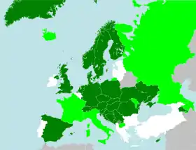 ![]() الدول الأعضاء التي وقعت وصدقت باللون الأخضر الداكن، وتلك التي وقعت ولكن لم تصدق باللون الأخضر، وتلك التي لم توقع ولم تصدق بالأبيض، والدول غير الأعضاء في مجلس أوروبا بالرمادي. المصدر: قائمة الموقعين list of signatories بموقع مجلس أوروبا. | |