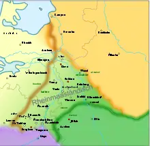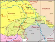 انتشار اللهجات الهولندية المعاصرة والألمانية الدنيا. الميز- راينية ترقم بأرقام: 13، 14، 15، بالإضافة إلى معظم أجزاء المنطقة المتاخمة 11
