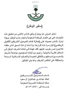 - الاقتصادية : الملك يوشح الأهلي بلقب «سفير الوطن».. ويكافئه بـ 4ملايين نسخة محفوظة 10 يوليو 2017 على موقع واي باك مشين.