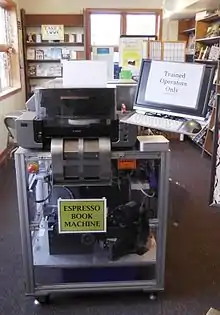 20. ^«الكتاب يعتنقون النشر الذاتي من خلال آلة النشر الفورية». (أوريغون) أسوشيتد برس. 11 June 2012. تم استردادها 20 أكتوبر 2017.... مطبعة إسبريسو من قبل كتب الطلب لأول مرة في عام 2006...
