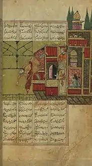 ![]() رسم توضيحي يعود للقرن الحادي عشر للنعمان وهو يرمي سنمار من سطح قصر الخورنق. | |