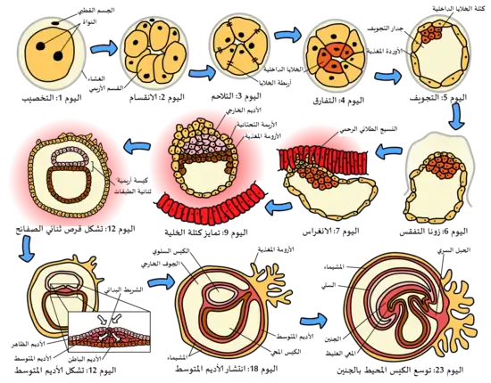بعد الإخصاب تنتقل البويضة الملقحة عبر قناة فالوب حتى تصل للرحم لتنغرس فيه، في الوقت نفسه تنقسم البويضة الملقحة إلى عدة خلايا تشبه حبة التوت، الجزء الداخلى من هذه الخلايا تُكّون الجنين، والجزء الخارجي من هذه الخلايا تُكّون الأغشية التي تحيط بالجنين لتغذيته وحمايته.