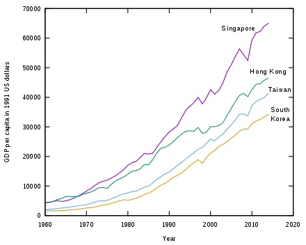 في منتصف ستينيات القرن الماضي، بدأت تايوان وكوريا الجنوبية بالاتجاه للتصنيع بمشاركة حكومية مكثفة. سعت الحكومتان إلى التصنيع الموجه للتصدير كما هو الحال في هونغ كونغ وسنغافورة.[11]