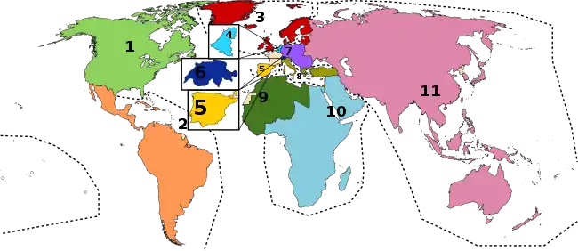 | الدائرة الحادية عشر | أخضر هليون | أوروبا الشرقية وبقية دول آسيا (ماعدا الشرق الأوسط والأناضول) وأوقيانوسيا | 49 |