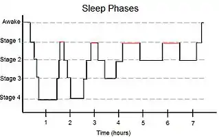 النوم يتقدم في الدوري الأزياء من خلال خمس مراحل. أربعة من هذه المراحل مجتمعة حركة العين غير السريعة (NREM) النوم في حين أن آخر دورة حركة العين السريعة الفترة. دورة تستغرق حوالي 90-110 دقائق لإكمال. اليقظة هي وجدت من خلال EEG تدابير تتسم موجات بيتا التي هي أعلى في التردد وأقل في السعة وتميل إلى التحرك بشكل غير متسق بسبب الكمية الهائلة من المحفزات شخص لقاءات بينما مستيقظا.