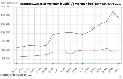 حسب تقرير رسمي من قبل وكالة المعاشات الحكومية السويدية، من المتوقع أن تكون إجمالي أعداد الهجرة إلى السويد خلال عام 2017 ما يقرب من 180,000 شخص، وأن يكون بعد ذلك حوالي 110,000 شخص سنويا.[11][12]