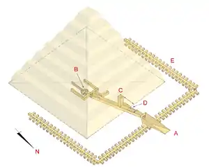 يقع مدخل الهيكل الجوفي إلى الشمال ، ويبدأ بممر ضيق ينحدر لحوالي 61 متر (200 قدم) حتى يلتقي بعمود رأسي من أعلى الممر. في هذا المكان ، هناك فقرة أخرى تؤدي إلى صف مكون من 136 معرضًا غير مكتمل تشكل شكل U حول الهرم. [11] يظهر معرضان آخران من هذه المجلات قبل المدخل مباشرة. حجرة الدفن ذات التصرف المماثل ، مثل نظرائهم ، لم يتم الانتهاء منها أبدًا.