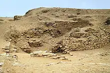 كان الهرم نفسه يقع في وسط المجمع ، بطول قاعدته 115 م (377 قدم) ، وكان به درجة واحدة فقط ولم يكتمل. خلال المرحلة التالية من التنقيب ، اكتشف غنيم ممرًا تنازليًا إلى الجانب الشمالي أدى إلى رواق مسدود بالركام و حجارة البناء. تم العثور على عدد من الأشياء أثناء التنقيب في هذا المعرض بما في ذلك عظام الحيوانات ، والبرديات الديموطيقية ، وأواني حجرية الأسرة الثالثة. في تابوت خشبي متحلل ، تم اكتشاف الذهب الذي تضمن أساور ذهبية وحقائب مستحضرات تجميل و خرزة وأواني منقوشة باسم سيخمخت. [5]