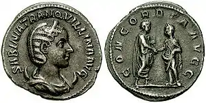 عملة إمبراطورية رومانية، صكت حوالي 241، مع رأس ترانكويلينا على الوجه، أو أمام العملة، وزواجها من غورديان الثالث يصور على الجانب الخلفي، أو الجانب الخلفي للعملة، في نطاق أصغر ؛ تظهر العملة الوجه - "الرأس" ، أو الجبهة - والعكس - "الذيل" ، أو العودة - هذا النمط لا يزال يسيطر على الكثير من العملات اليوم.