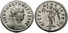 عملة نقدية رومانية إمبراطورية لـ ماركوس كلاوديوس تاسيتوس، الذي حكم لفترة وجيزة من 275 إلى 276 ، تتبع النمط التقليدي للعملات للوجه والعكس.