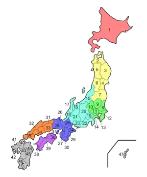 تتألف اليابان من 47 محافظة. ويمكن تقسيم هذه المحافظات على أساس الخلفية الجغرافية والتاريخية إلى ثماني مناطق وهي: هوكايدو وتوهوكو وكانتو وتشوبو وكينكي وتشوغوكو وشيكوكو وكيوشو - أوكيناوا. وتنفرد كل منطقة بلهجتها الخاصة وعاداتها وتراثها التقليدي. على سبيل المثال، تختلف منطقة كانتو التي تشمل طوكيو عن منطقة كانساي التي تضم أوساكا اختلافًا كبيرًا في كل شيء بدءًا من مذاق الأطعمة وحتى نوع الفنون التمثيلية التقليدية، ويستمتع الناس بتجربة الاختلاف والمقارنة بينهما. يبلغ عدد سكان اليابان 128 مليون نسمة.[31]