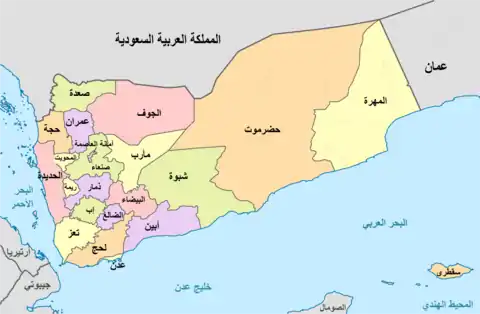 التقسيم الإداري لليمن تقسم اليمن إلى تقسيمان رئيسيان هما (محافظة - مديرية)، وتبلغ عدد المحافظات 22 محافظة شاملة أمانة العاصمة صنعاء ومحافظة أرخبيل سقطرى،[7] وتتكون المحافظة من عدة مديريات، ويبلغ عدد المديريات في اليمن 333 مديرية. الإدارية ضمن التقسيم الإداري للجمهورية اليمنية، وتنقسم الجمهورية إلى (20) محافظة بالإضافة إلى أمانة العاصمة، وتتكون محافظات اليمن من عدد من المديريات يتفاوت عددها من محافظة إلى أخرى.[8]