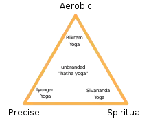 نما عدد المدارس وأنماط اليوغا في العالم الغربي بسرعة منذ أواخر القرن العشرين. بحلول عام 2012 ، كان هناك ما لا يقل عن 19 أسلوبًا متداولًا من (استشلن فيينا يوجا) إلى يوجا فييني. تؤكد هذه الجوانب المختلفة بما في ذلك التمارين الهوائية والأسانات الدقيقة والروحانية على تقليد يوجا الهواء. يمكن توضيح هذه الجوانب من خلال المدارس النمطية. وهكذا ، فإن بيكرام يوغا لديها أسلوب تمارين هوائية مع تسخين الغرف إلى 105 درجة فهرنهايت (41 درجة مئوية) وتسلسل ثابت من تمرينين للتنفس و 26 أساناس يتم إجراؤها في كل جلسة. يؤكد لانجر جو على محاذاة الموقف الصحيحة ، والعمل ببطء ، إذا لزم الأمر مع الدعائم ، وينتهي بالاسترخاء. يركز جوا السيفااندا بشكل أكبر على الممارسة الروحية ، مع 12 وضعًا أساسيًا ، وترديد السنسكريتية ، وتمارين تنفس البراناياما ، والتأمل ، والاسترخاء في كل فصل ، ويعلق أهمية على النظام الغذائي النباتي.