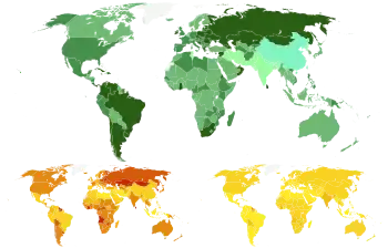 [[Image:Female suicide rates 2015 (crude).svg|200px|Suicide rates per 100,000 males (left) and females (right).[10]