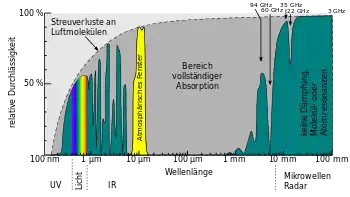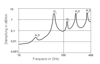 تمتص الأشعة الكهرومغناطيسية في جو الأرض بشدة كلما تزايد ترددها . وتمتص جزيئات مكونات الهواء من أكسجين ونيتروجين وبخار ماء وثاني أكسيد الكربون وغيرها أشعة الشمس بطريقة مميزة عند ترددات معينة. وبصفة خاصة يمتص بخار الماء الموجود في الجو أشعة لها ترددات في نطاق K من الطيف مما يجعل الاتصالات في مناطق المطر صعبة . وتبلغ خطوط الامتصاص للأكسجين والماء: