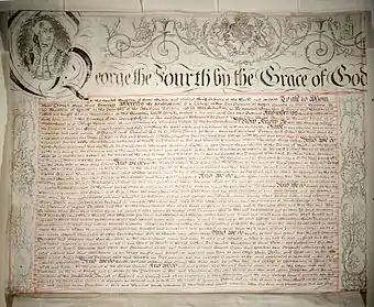 الامتياز الملكي الذي منحه الملك جورج الرابع سنة 1827 لتأسيس كلية الملك بتورنتو. الآن موجود في جامعة تورنتو