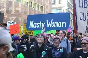 ![]() متظاهرة ترفع لافتة "امرأة سيئة" في المسيرة النسوية بشيكاغو، يناير 2017 | ||||