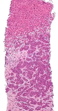 انبثاث ثبُت عن طريق خزعة من الكبد (الورم (سرطانة غدية)- ثلثي الصورة بالأسفل). صبغة الهيماتوكسيلين والإيوسين