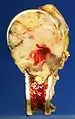 قطاع من عظمة العضد يظهر طوليًا، موضحًا انبثاث سرطاني كبير (الورم الأبيض بين رأس وجسم العظمة)