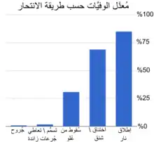 وتمثل حالات الانتحار باستخدام المبيدات الحشرية 30% من حالات الانتحار على مستوى العالم. ومع ذلك، يتباين استخدام هذه الطريقة بشكل ملحوظ بين البلدان بداية من 4% في أوروبا إلى أكثر من 50% في منطقة المحيط الهادئ.[79] كما أنها طريقة شائعة أيضًا في أمريكا اللاتينية بسبب سهولة الوصول إليها وسط فئات السكان المزارعين.[62] وفي كثير من البلدان، يمثل تعاطي جرعات زائدة من المخدرات حوالي 60% من حالات الانتحار بين النساء و30% بين الرجال.[80] والكثير من هذه الحالات لا يكون مخطط لها وتحدث خلال فترة من التناقض الحاد.[62] ويختلف معدل الوفيات حسب الطريقة: الأسلحة النارية 80-90%، والغرق 65-80%، والشنق 60-85%، وعوادم السيارات 40-60%، والقفز 35-60%، والاختناق بحرق الفحم 40-50%، والمبيدات الحشرية 6-75%، والجرعة الزائدة من الأدوية 1,5-4%.[62] وتختلف الطرق الأكثر شيوعًا لمحاولة الانتحار عن الطرق الناجحة الأكثر شيوعًا للانتحار، حيث أن هناك ما يصل إلى 85% من محاولات تجري عن طريق تناول جرعة زائدة من المخدرات على مستوى العالم المتقدم.[23]