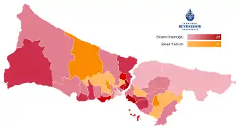المناطق التي فاز بها أكرم إمام أوغلو (أحمر) و بن علي يلدرم (برتقالي)