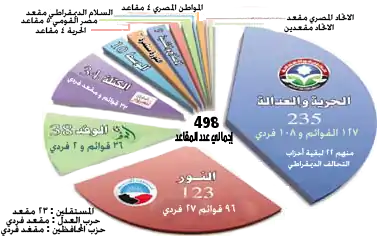 ملحوظات: 1 التحالف الديمقراطي من أجل مصر: يضم أحزاب الحرية والعدالة والكرامة والحضارة وغد الثورة والعمل والإصلاح ومصر العربي الاشتراكي ومستقلون (تم حسابهم مع مقاعد الحرية والعدالة).