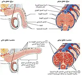 ![]() تشكل الأعمدة الثلاثة من أنسجة الانتصاب معظم حجم القضيب عند الإنسان. | |