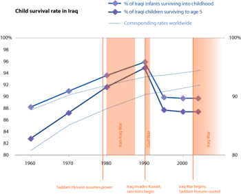 - "Child death rate doubles in Iraq". بي بي سي. May 25, 2000. نسخة محفوظة 11 يناير 2006 على موقع واي باك مشين.