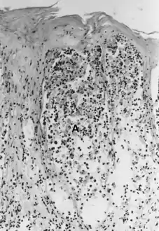 ![]() الحمى القلاعية - انحلال الأشواك في عينة جلدية. يمكن ملاحظة نخر الطبقة الشائكة، وملاحظة الخلايا الكيراتينية طائفة من السائل الحويصلي. الحمى القلاعية - انحلال الأشواك في عينة جلدية. يمكن ملاحظة نخر الطبقة الشائكة، وملاحظة الخلايا الكيراتينية طائفة من السائل الحويصلي. | |