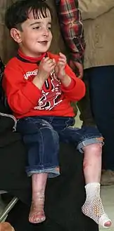 ![]() طفلٌ عراقيٌ ذو خمسة أعوام مصابٌ بانحلال البشرة الوراثي طفلٌ عراقيٌ ذو خمسة أعوام مصابٌ بانحلال البشرة الوراثي | |