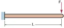 - الانحناء المرن , زاوية الانحناء (راديان) عند الطرف الحر كما موضح في الصورة، يمكن حساب الانحناء لكمرة كابولي (ليس لها وزن) عليها حمل طرفي عن طريق:[1]