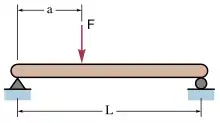 - أقصي انحناء لكمرة بسيطة محملة بعيدة عن المنتصف عند مسافة من الركيزة يمكن حسابها عن طريق: