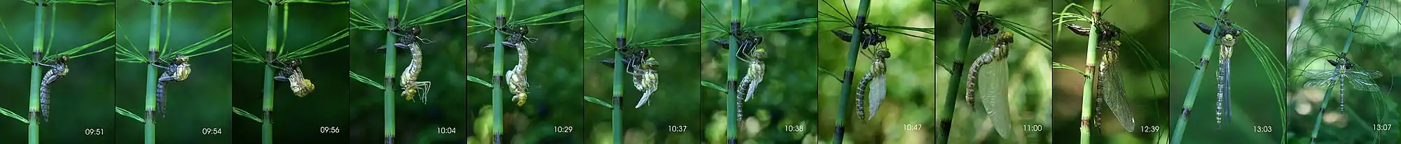 | يمين: دقنوش كبير الرأس ذو ريش عاديّ. يسار: دقنوش كبير الرأس يمرُّ بمرحلة الانسلاخ. | |