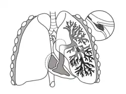 ![]() رسم توضيحي للرئة يصور الانصمام الرئوي على أنه خثرة (جلطة دموية) انتقلت من منطقة أخرى من الجسم، مسببة انسداد الشريان الرئوي القصبي، مما يؤدي إلى خثار شرياني من الفصوص العلوية والسفلية في الرئة اليسرى رسم توضيحي للرئة يصور الانصمام الرئوي على أنه خثرة (جلطة دموية) انتقلت من منطقة أخرى من الجسم، مسببة انسداد الشريان الرئوي القصبي، مما يؤدي إلى خثار شرياني من الفصوص العلوية والسفلية في الرئة اليسرى | |