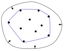 الانغلاق المحدب هو شكل الذي يأخذه شريط مطاطي محيد بمجموعة النقاط (المضلع الأزرق).