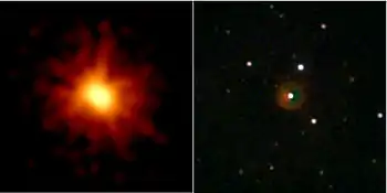 - المنحنى المميز بنقاط دائرية هي قياسات للتلسكوبات الأرضية المختلفة التي تقوم بالتصوير في نطاق الضوء المرئي، وهي ذات ألوان مختلفة تدل على المرصد الذي قام بقياسها. وأما الدائرة الحمراء فقد قام بتسجيلها تلسكوب هابل الفضائي بعد نحو 10 ملايين ثانية، ويعطي المحور الأفقي الزمن بتقسيم لوغاريتمي.
