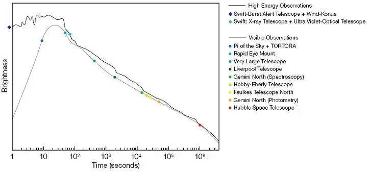 - المنحنى المعرف بمعيّنات زرقاء وخضراء هي قياسات سجلها مرصد سويفت الفضائي للأشعة ذات الطاقة العالية، من ضمنها الأشعة السينية والأشعة فوق البنفسجية.