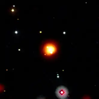صورة للأشعة فوق البنفسجية لمسبار سويفت ومنطبق عليها صور تلسكوب ضوئي تبين نجوم ساطعة، وكذلك صورة منطبقة عليهما لتلسكوب يقيس الأشعة السينية وهو يلتقط صورة الانفجار باللونين البرتقالي والأصفر. تنشر الصورة بتصريح من NASA/Swift/Stefan Immler